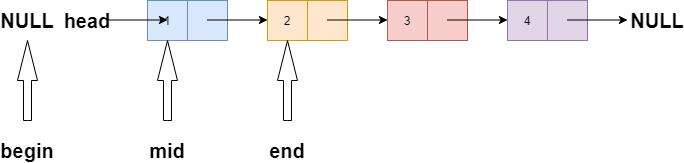 bigen指针指向初始化为空null,mid指针指向初始化为链表头head,end指针指向初始化为第二节点。