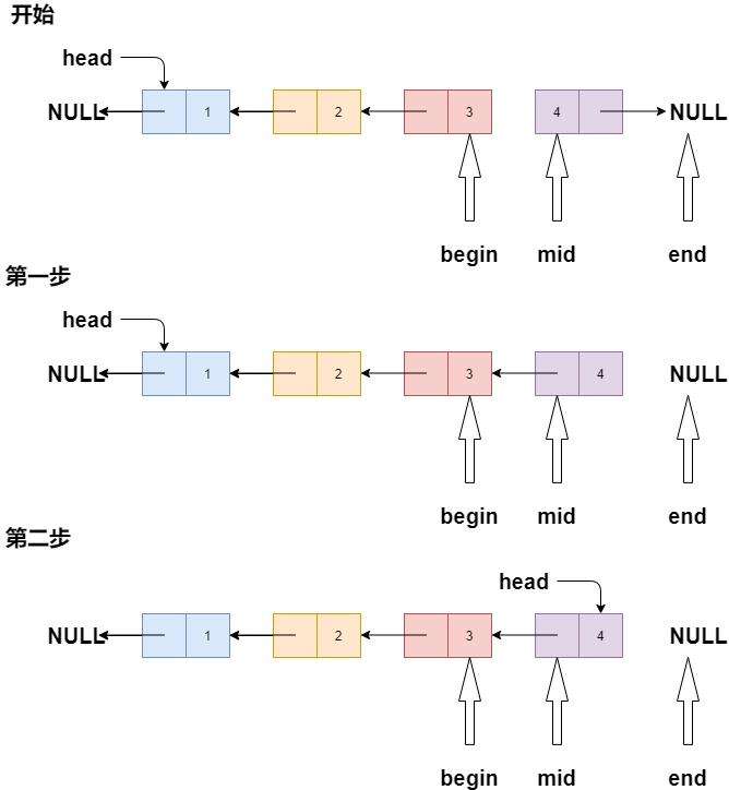 第一步:mid指针指向的节点的指针域要与begin相同。也就是mid指针指向的节点的指针域变成与begin相同的值null。这样子链表第一节点也就是链表头会和其他节点分离出来。