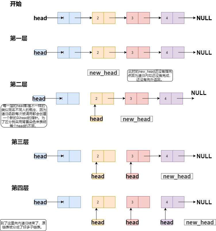 //递归内入,原链表被分成多个子链表,直到最后一个节点。最后一个节点也会被分成只有一个链表头的子链表