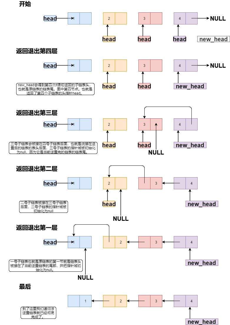 现在开始递归向外层,一层一层退出。并进行子链表的逆置衔接。完成逆置。