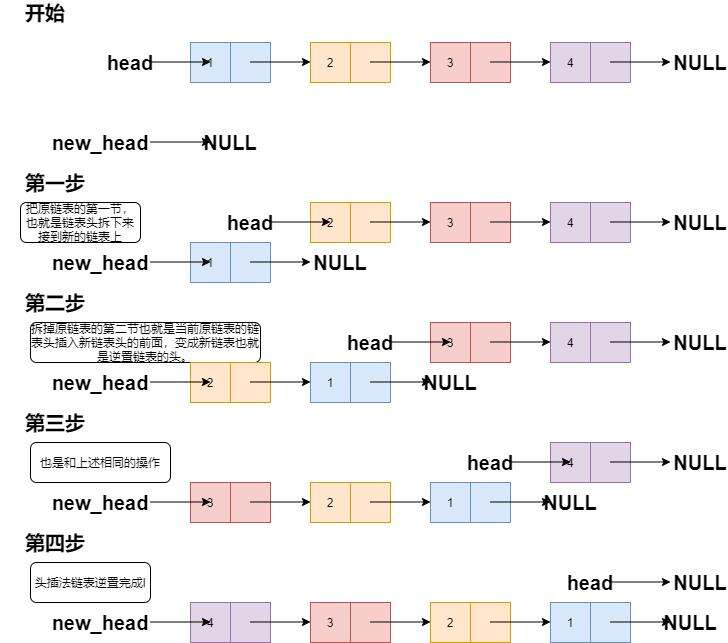 头插法比较好理解。在原有链表的基础上,依次将位于链表头部的节点摘下,然后采用从头部插入的方式生成一个新链表,则此链表即为原链表的逆置版。