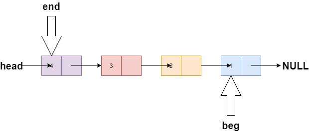 //调整 end 的指向,另其指向 beg 后的一个节点,为反转下一个节点做准备