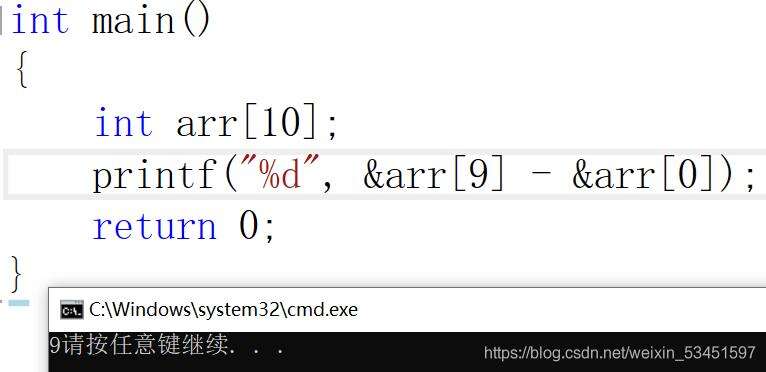 由此可知,指针-指针得到的值的绝对值是两者之间元素的个数