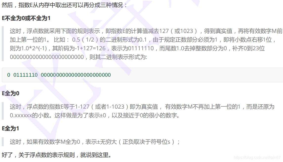 ??所以我们将E存入内存时就需要借助一个中间数,对于 8 位的E,这个中间数是 127 ,所以实际在内存中存放的 E= -1 + 127 = 126.