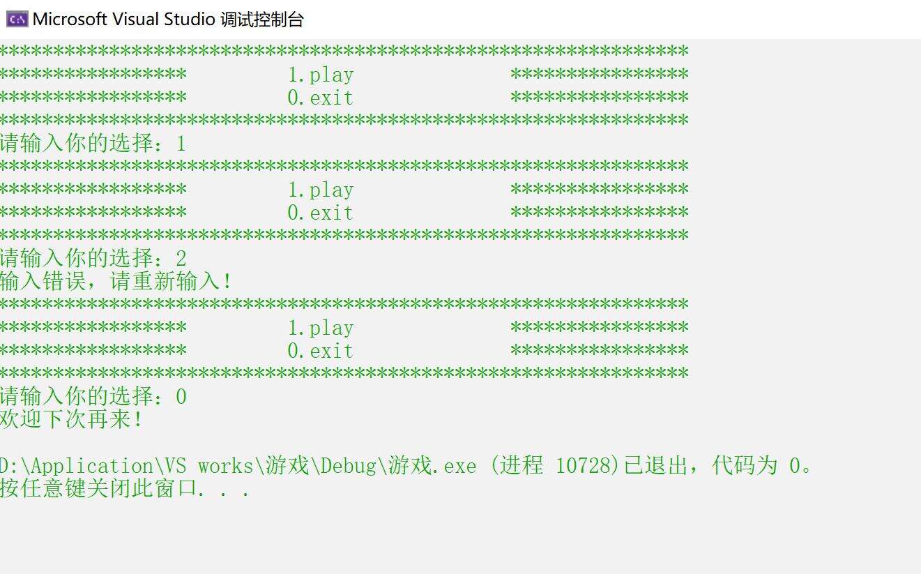 {case 1://play play();break;case 0://退出printf("欢迎下次再来!\n");break;default://当玩家输入了非法字符,让其重新选择printf("输入错误,请重新输入!\n");