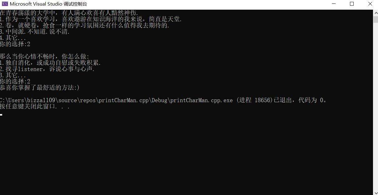 printf("2.不喜,不喜,很不喜.眼睛快瞎了.脑壳有点卡...\n");