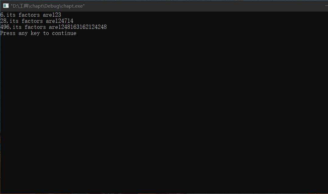 题目概述: 一个数如果恰好等于它的因字之和就是“完数” 编程: #includestdio.h int main() { int m,s,i; for(m=2;m1000;m++) { s=0; for(i=1;im;i++) if((m%i)0) s=s+i; if(sm) { printf(%d,its factors are...