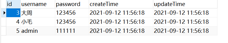 ) ENGINE=InnoDB AUTO_INCREMENT=6 DEFAULT CHARSET=utf8 COMMENT='用户表';然后手动新增了 3 个用户: