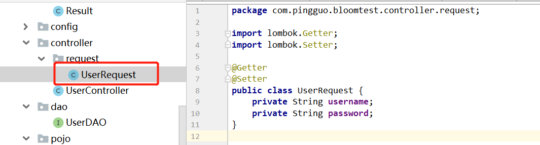 }另外,这里的传参UserRequest user,也是为了便于获取请求参数,而创建的类。