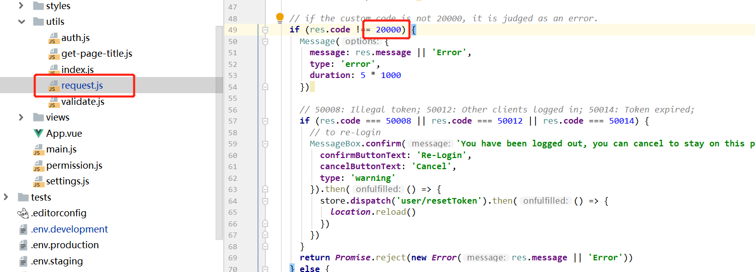 至于我后端接口返回成功code 为什么是 20000呢?是因为前端框架里做了统一的封装,这里喜欢的话你自己也可以改成别的。