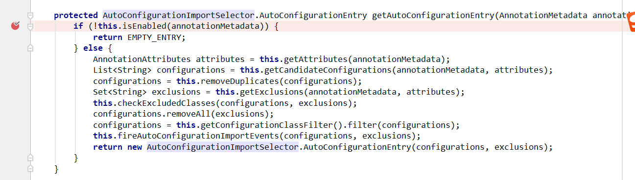 往下翻一点,就是getAutoConfigurationEntry()的实现,在这里打个断点(把上面的断点取消掉)。