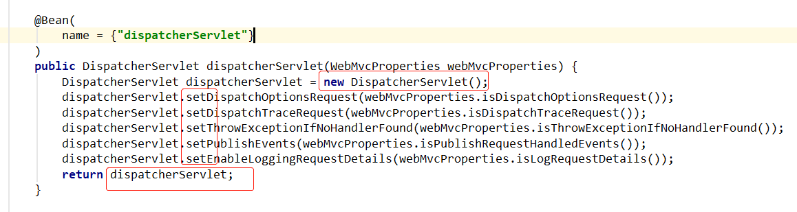 继续往下就看到方法dispatcherServlet(),而且是加了@Bean注解,就是给容器中注册DispatcherServlet类型的组件。