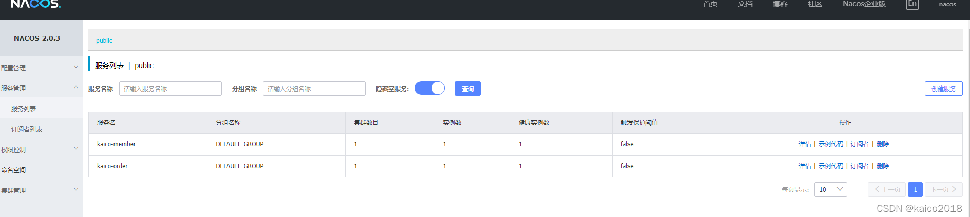 }启动项目之后,可以在nacos页面看到注册的服务信息。