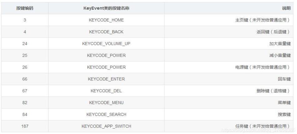 一、检测点击按键事件一般不对手机上的输入按键进行处理,直接由系统按照默认情况操作。当然有时为了改善用户体验,需要让应用拦截按键事件,并进行额外处理。 要想监控按键事件,首先得知道每个按键的编码,这样才能根据不同的编码值进行相应的处理。监听器OnKeyListener只会检测控制键,不会检测文本键。实际测试发现HOME、SWICH、POWER普通的app是接收不到事件的,这几个事件在framew里面处理了。