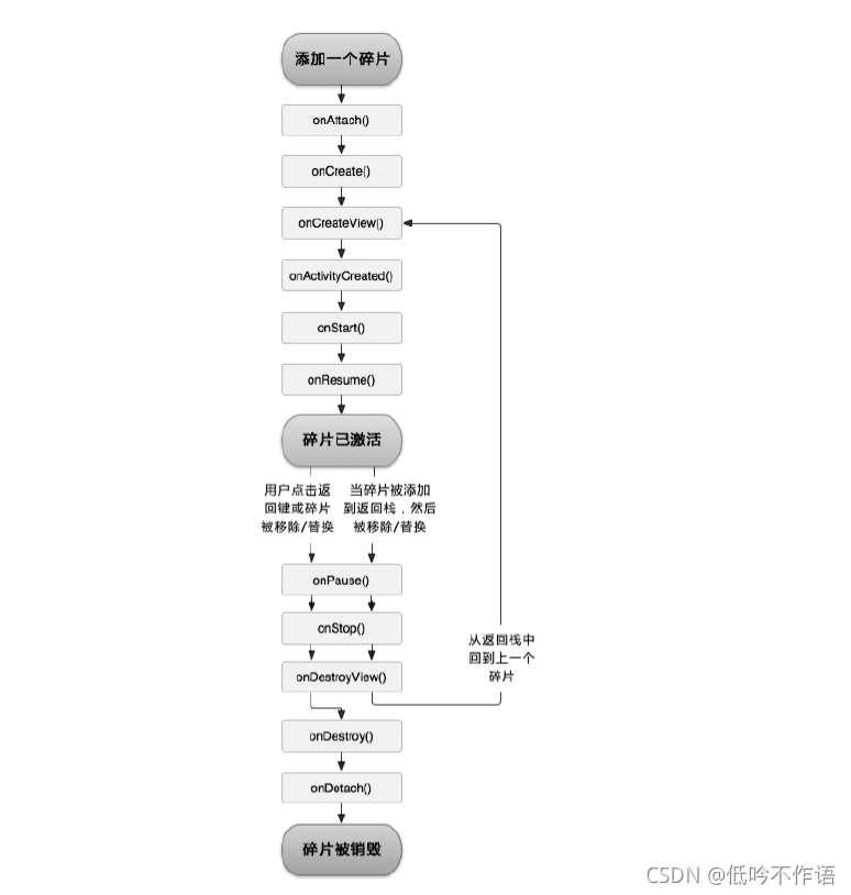 当 Activity 被销毁时,与它相关联的 Fragment 就会进入销毁状态,或者通过调用 FragmentTransaction 的 remove()、replace() 方法将 Fragment 从 Activity 中移除,但在事务提交前没有调用了 addToBackStack() 方法,也会进入销毁状态
