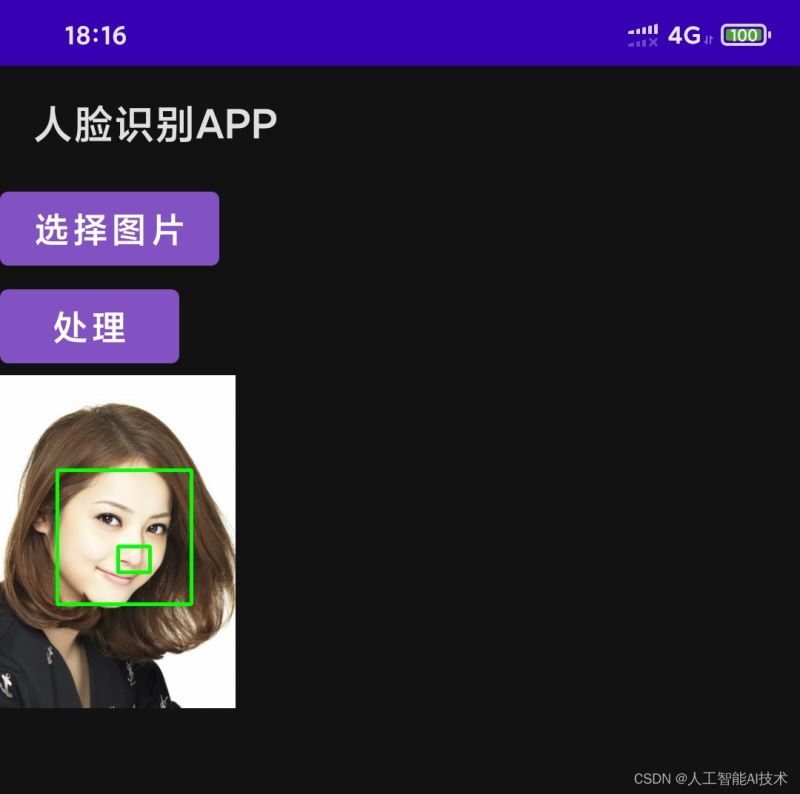 如上图所示,APP运行后,点击“选择图片”,从手机中选择一张图片,然后点击“处理”,APP会将人脸用矩形给框起来,同时把鼻子也给检测出来了。由于目的是给大家做演示,所以APP设计得很简单,而且也只实现了检测人脸和鼻子,没有实现对其他五官的检测。而且这个APP也只能检测很简单的图片,如果图片中背景太复杂就无法检测出人脸。