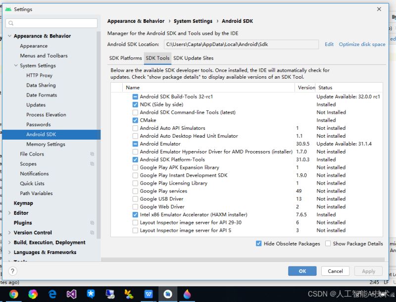 点击“Appearance & Behavior”->“System Settings”->“Android SDK”->“SDK Tools”。