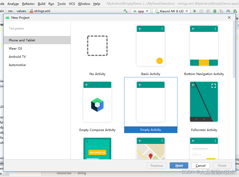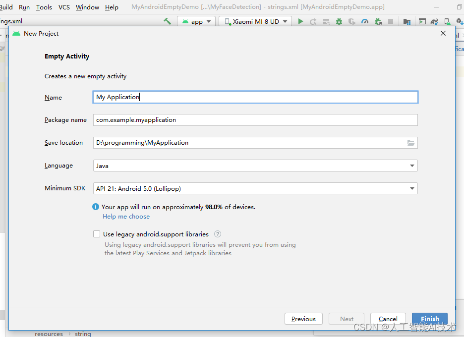 “Language”选择“Java”,Minimum SDK选择“API 21”。点击“Finish”