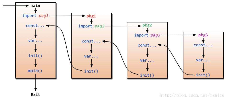 程序的初始化和执行都起始于main包。如果main包还导入了其它的包,那么就会在编译时将它们依次导入。有时一个包会被多个包同时导入,那么它只会被导入一次(例如很多包可能都会用到fmt包,但它只会被导入一次,因为没有必要导入多次)。当一个包被导入时,如果该包还导入了其它的包,那么会先将其它包导入进来,然后再对这些包中的包级常量和变量进行初始化,接着执行init函数(如果有的话),依次类推。等所有被导入的包都加载完毕了,就会开始对main包中的包级常量和变量进行初始化,然后执行main包中的init函数(如果存在的话),最后执行main函数。下图详细地解释了整个执行过程: