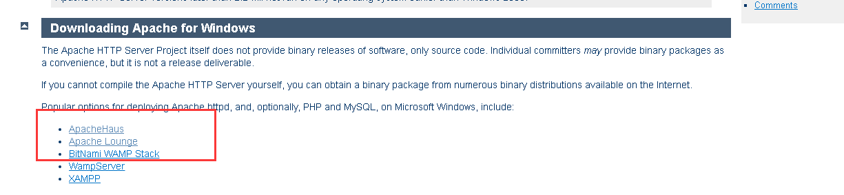 下载地址:http://httpd.apache.org/docs/current/platform/windows.html#down其中前三个网站是可以独立下载apache httpd的,后面两个是包含 Apache httpd, and,PHP and MySQL的集成环境。在这里我们只是需要apache httpd 。
