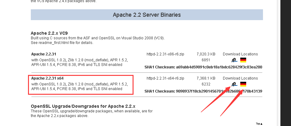 这时,我们根据自己的windows 服务器的版本选择,我选择了 Apache2.2 点击红色箭头的图标,即可进入下载链接,进行下载。