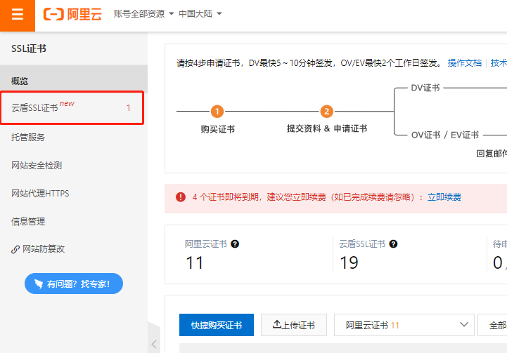 阿里云免费SSL证书需要支付0元,购买云盾证书资源包中的免费证书扩容包:
