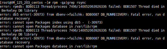 rpm -qa|grep rsyncerror: rpmdb: BDB0113 Thread/process 7496/140052063926336 failed: BDB1507 Thread died in Berkeley DB libraryerror: db5 error(-30973) from dbenv-failchk: BDB0087 DB_RUNRECOVERY: Fata