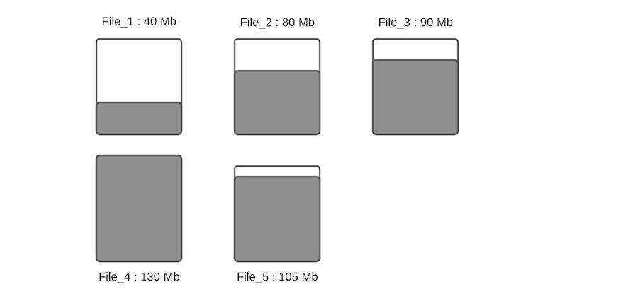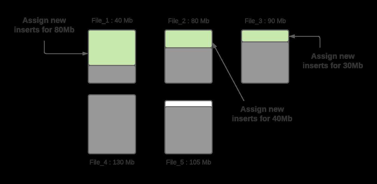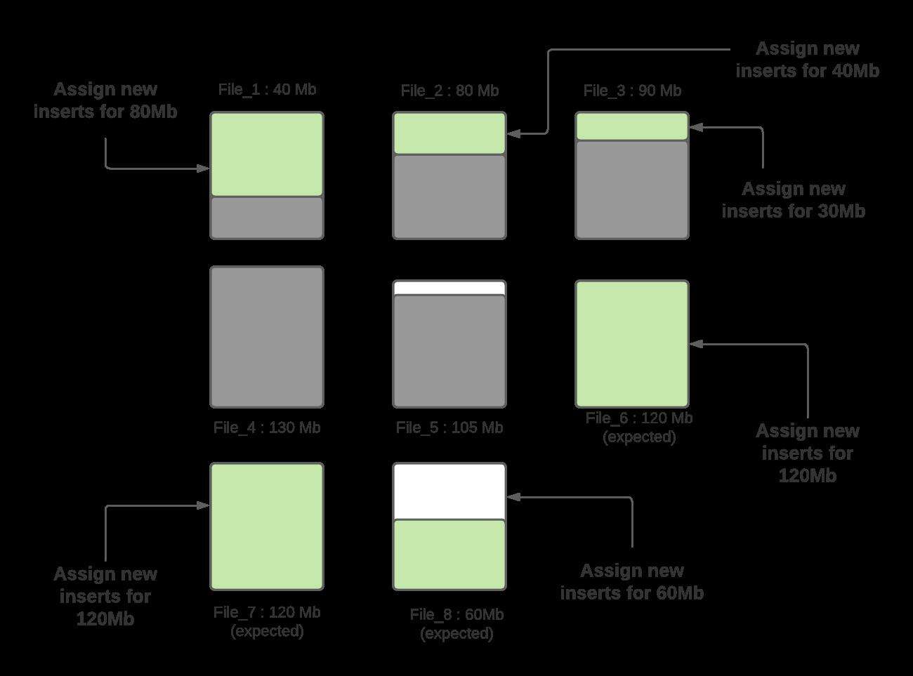 步骤三:确定小文件后,新插入的记录将分配给小文件以便使其达到120MB,File_1将会插入80MB大小的记录数,File_2将会插入40MB大小的记录数,File_3将插入30MB大小的记录数。