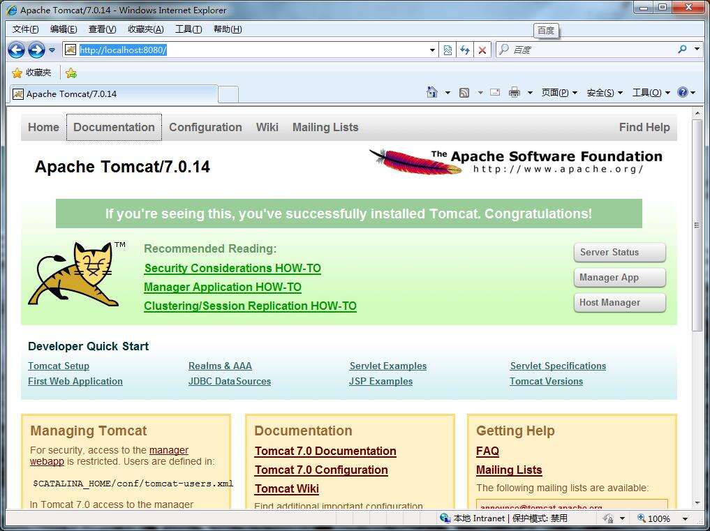完成设置后,输入地址localhost:8080 就可看到 Tomcat 的管理页面。
