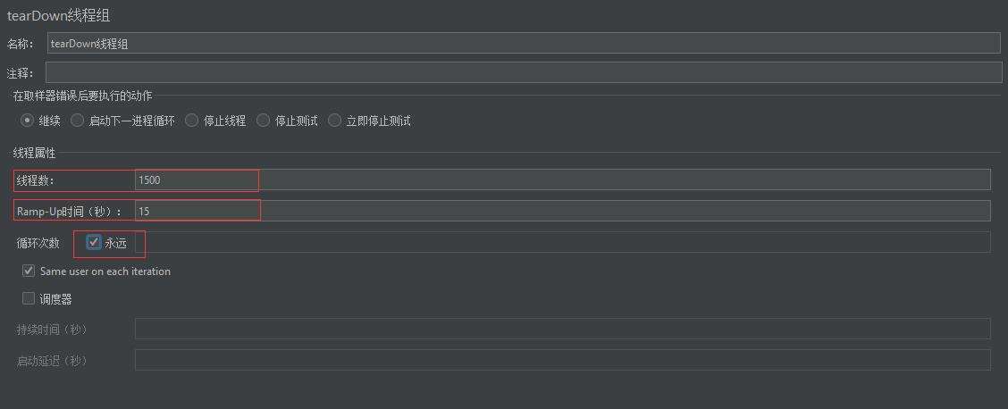 3. 循环次数:每个线程发送请求的次数。如果线程数为10,循环次数为100,那么每个线程发送100次请求。总请求数为10*100=1000 。如果勾选了“永远”,那么所有线程会一直发送请求,一到选择停止运行脚本。