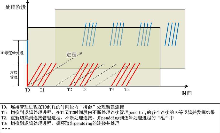 ??首先,连接管理进程依靠Linux内核中高效的epoll机制可以非常好的应对海量新建连接,毕竟该进程只是把新建连接pendding给后面的逻辑处理进程,所以处理是非常高效的,通过pendding可以把对CPU的时间要求转换为内存的空间要求,这正是换一种切法带来的直接收益。