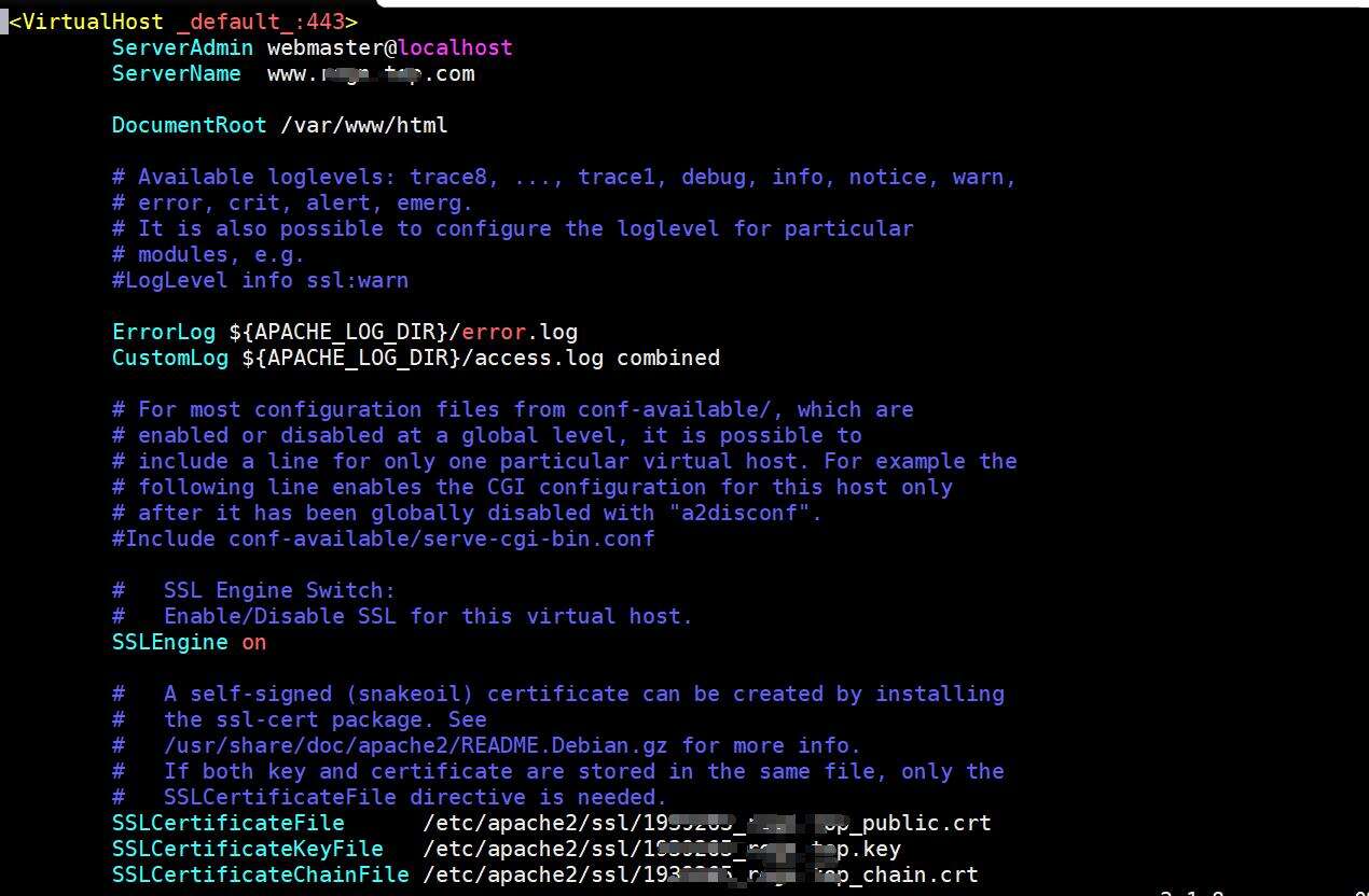 <IfModules mod_ssl.c> <VirtualHost *:443> ServerName www.YourDomainName.com。 SSLCertificateFile /etc/apache2/ssl/YourDomainName_public.crt #证书文件路径+证书文件名。 SSLCertificateKeyFile /etc/apache2/ssl/YourDomainName.com.key SSLCertificateChainFile /etc/apache2/ssl/YourDomainName.com_chain.crt