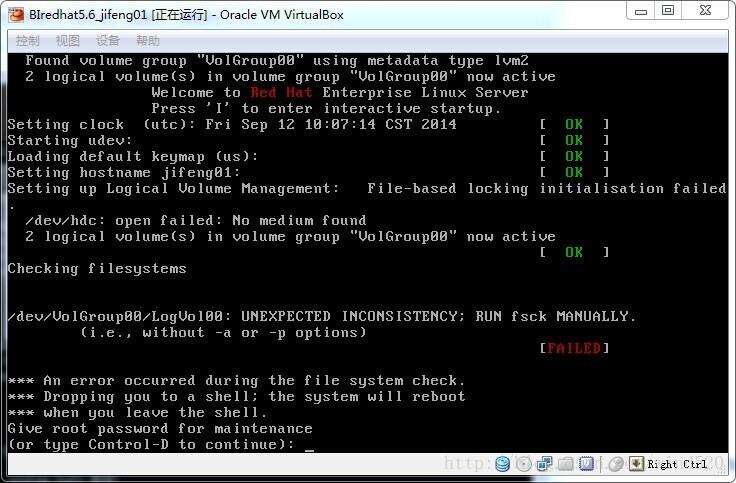 1:按Control-D,系统自动重启:2:直接输入root的密码进入命令行3:看网上的介绍需要输入mount |grep “on/” 找到root的分区,我试过后无效4:直接输入fsck -y /dev/VolGroup00/LogVol00(看上图),回车开始自动...
