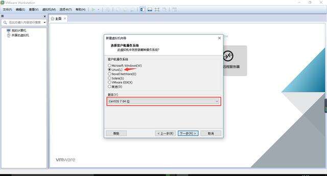 d)客户机操作选择“Linux”,版本选择“CentOS 7 64位”,点击“下一步”