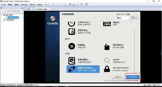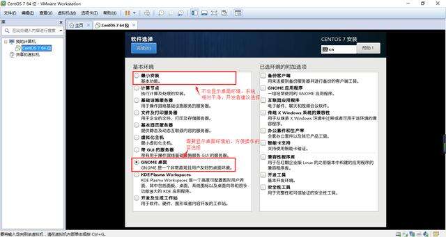 软件选择:决定了系统安装后包括哪些功能,如果使用默认值,那么系统安装后是没有图形界面的;选择“GNOME 桌面”,会显示图形界面;本着学习的目的,这里选择默认设置“最小安装”