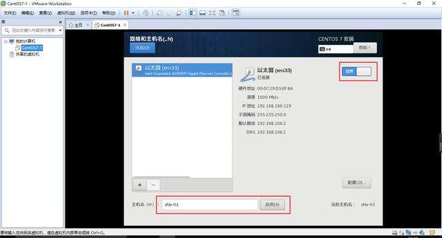 网络和主机名:打开连接开关,记住IP地址,SSH登录时使用,设置主机名,点击“应用”生效