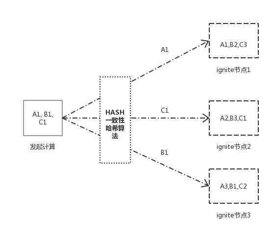 在ignite中,有传统的MapReduce模型的分布式计算,也有基于分布式存储的并置计算,当数据分散到不同的节点上时,根据提供的并置键,计算会传播到数据所在的节点进行计算,再结合数据并置,相关联的数据存储在相同节点,这样可以避免在计算过程中涉及到大量的数据移动,有效保证计算的性能。