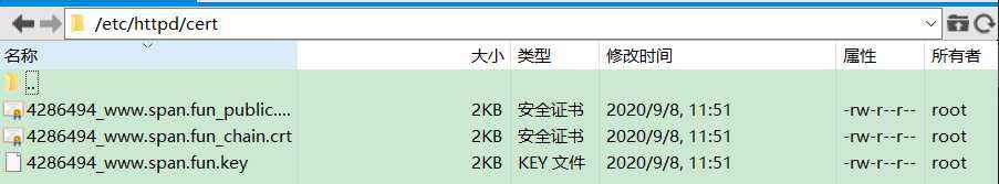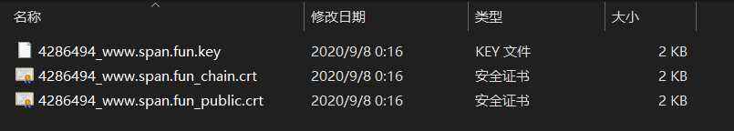 说明 :如果申请证书时选择了手动创建CSR文件,请将手动生成创建的密钥文件拷贝到cert目录中并命名为domain name.key。