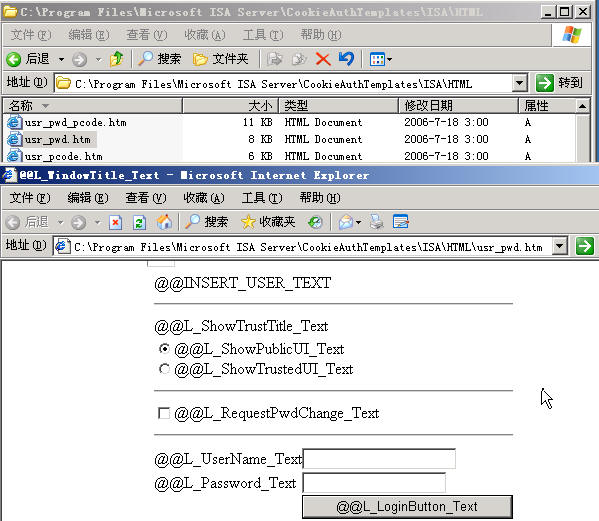 - 强烈建议在修改之前进行备份;建议通过复制来新建一个 登录表单目录并进行修改,而不修改原有目录;新的登录表单目录必须位于 %ISA_Install_Folder%\CookieAuthTemplates 目录中;