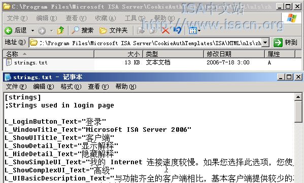 因此,当使用不同语言的用户登录时,ISA Server 只需要根据不同语言的 Strings.txt 替换对应的字段即可 。英文版的 Strings.txt 保存在和 HTML 源文件相同的目录中,而其他语言的 Strings.txt 保存在 nls 目录的对应子目录中,如下图所示,中文版的 Strings.txt 存放目录及内容。