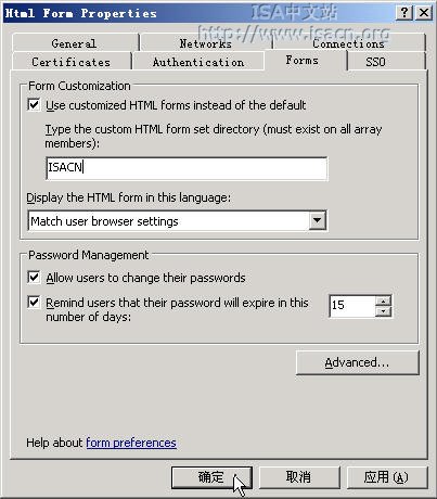 我对 ISACN 目录下的 usr_pwd.htm 和中文 Strings.txt 进行修改,然后配置 Web 侦听器使用此表单,如下图所示。如果是 ISA Server 企业版,需要将这个目录复制到其他阵列服务器的相同位置;