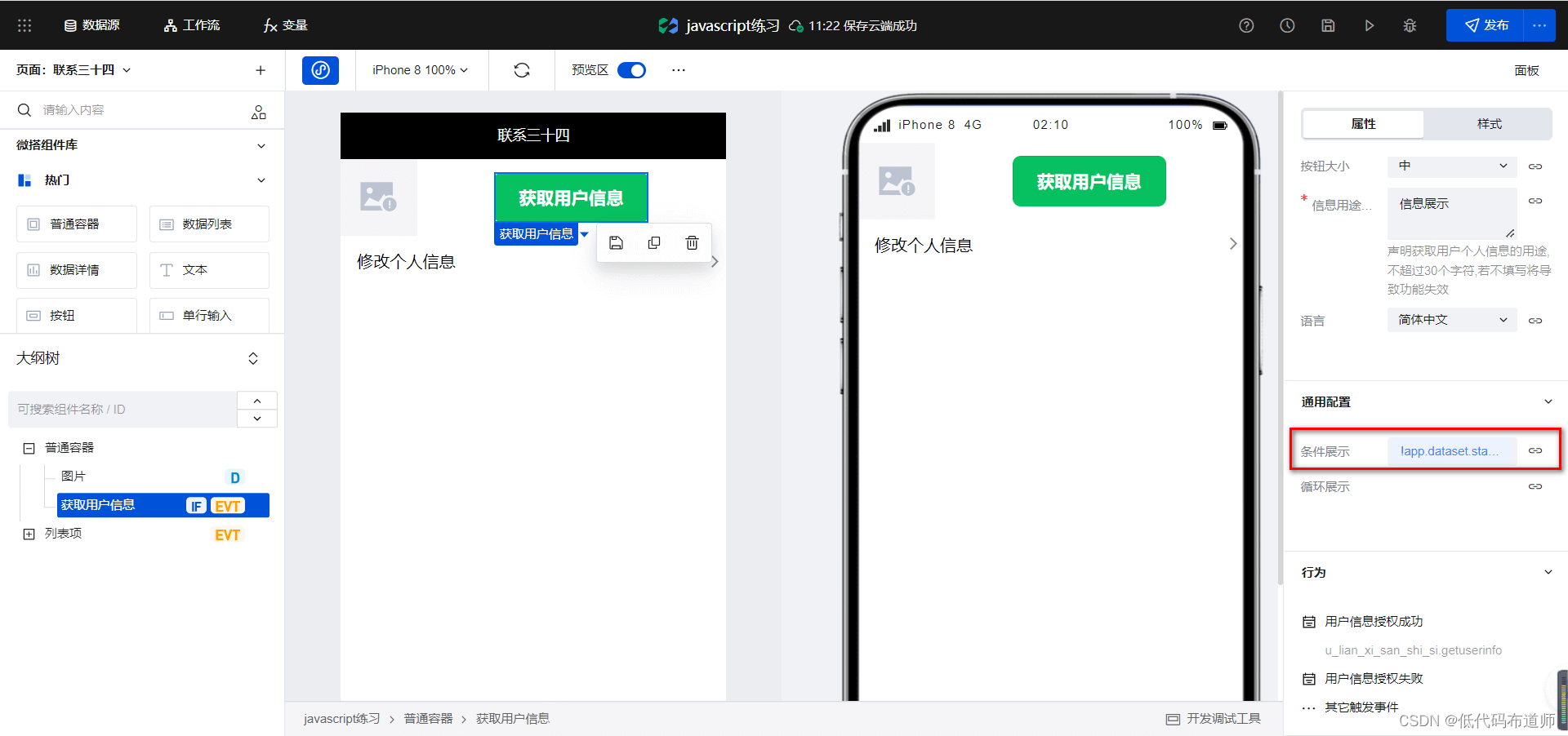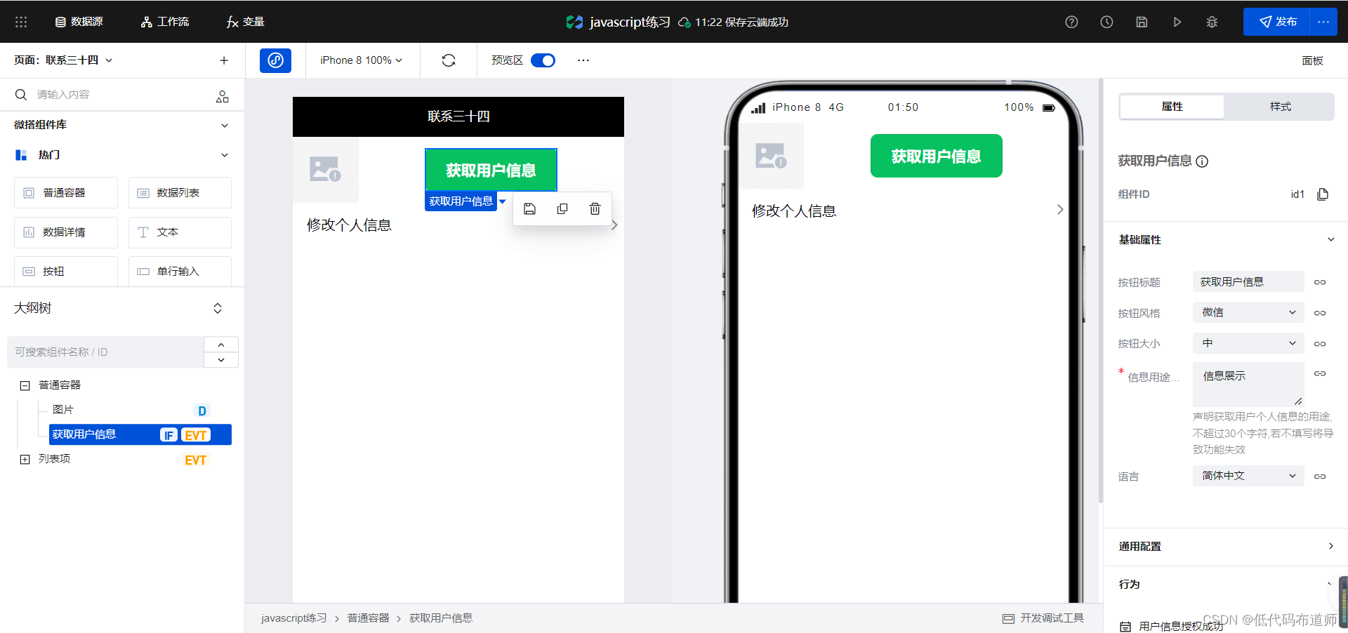 这个组件使用的时候要注意右侧的属性面板里的信息用途必须填写,否则点击按钮无法弹出授权按钮来。