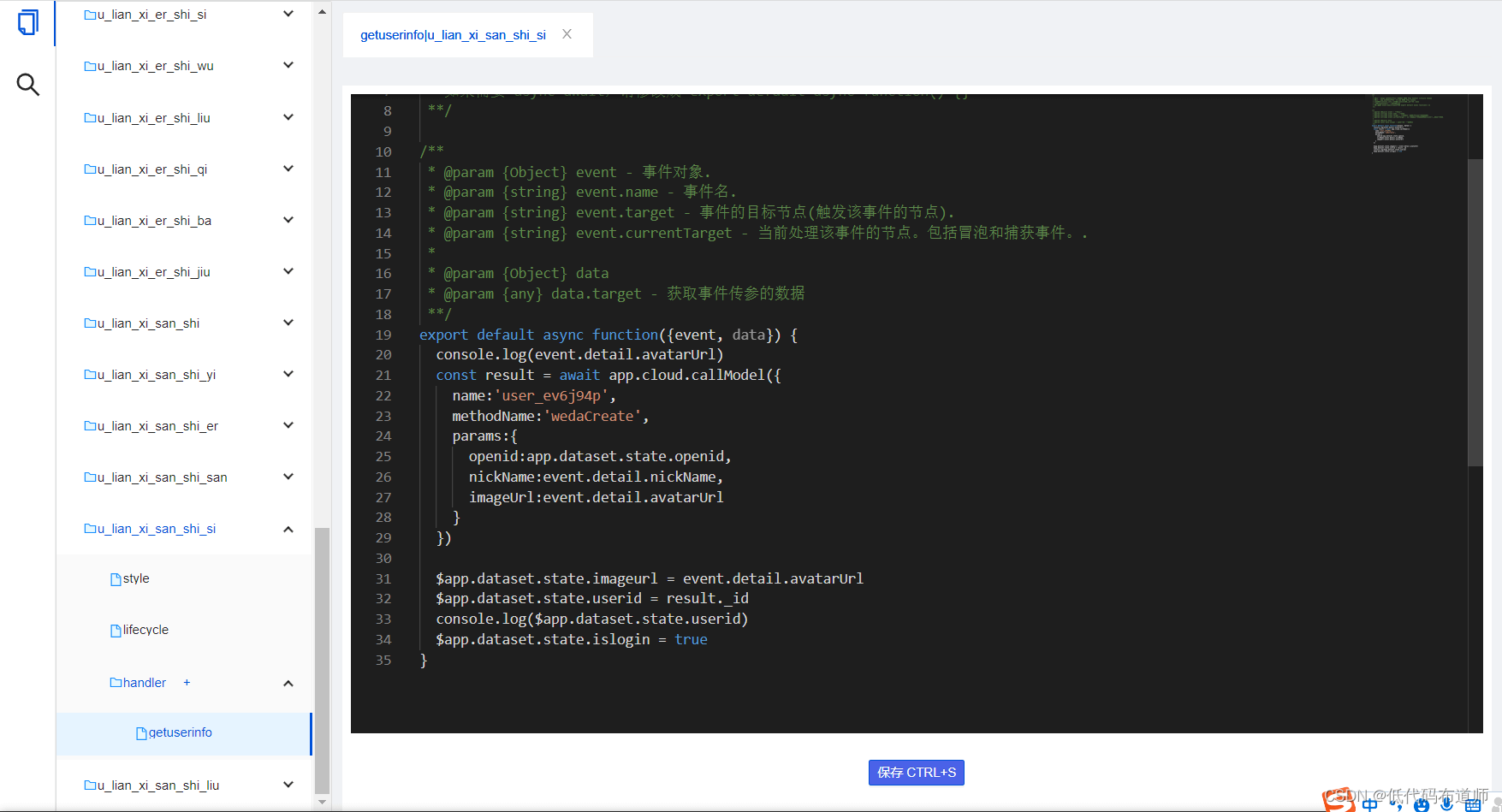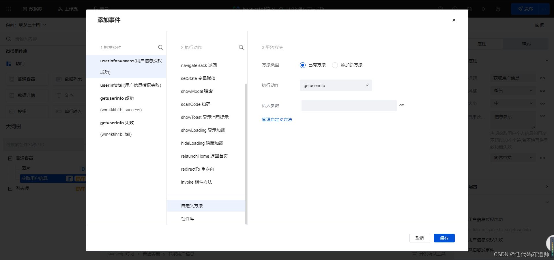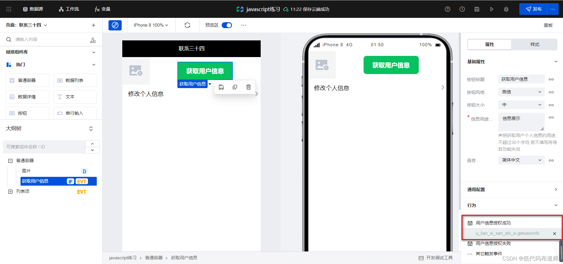 要想让用户信息写入数据源中,我们需要给组件绑定事件,我们这里绑定的是用户授权信息成功这个事件