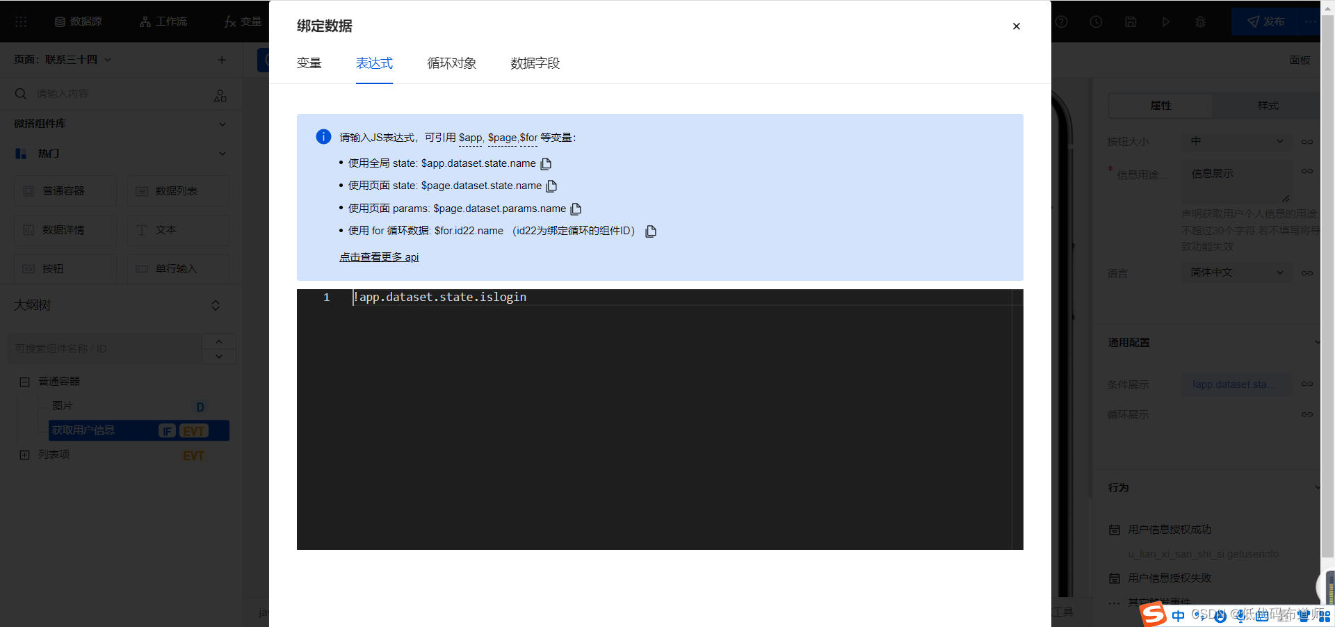 要解决上边的问题,首先需要给注册按钮绑定条件展示。我们在登录功能里定义了一个全局变量islogin。如果未注册之前,这个变量的值是false,注册之后就变成了true。我们给注册按钮的条件展示绑定表达式,对islogin取一下反就可以